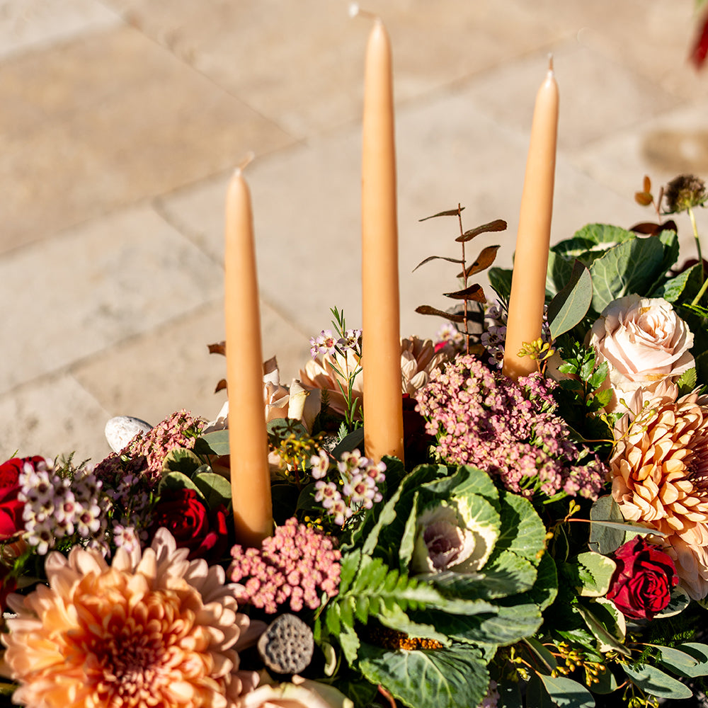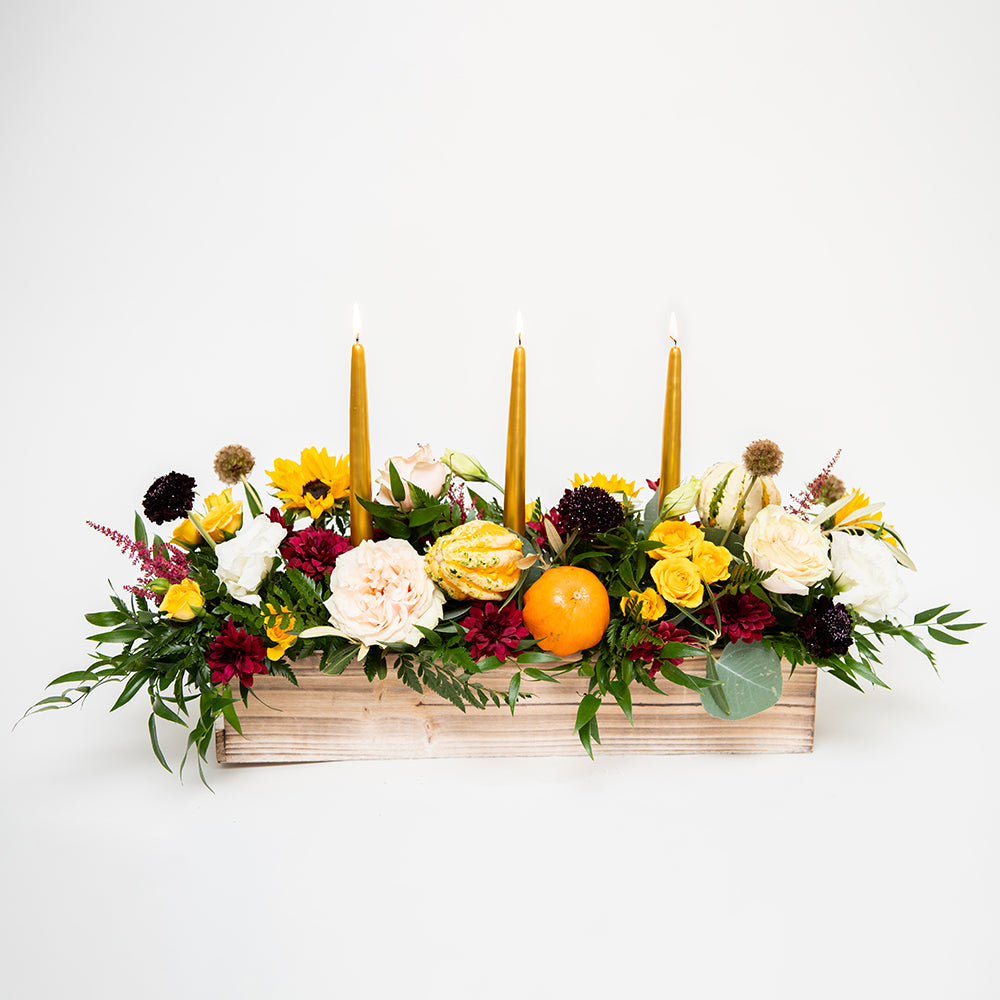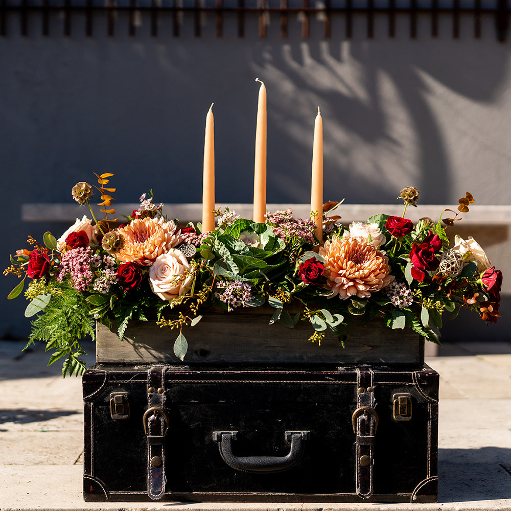 This elegant centerpiece made in a wooden box combines lush florals, autumnal textures, and soft candlelight.